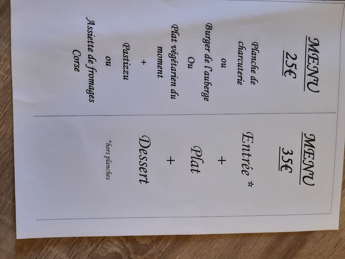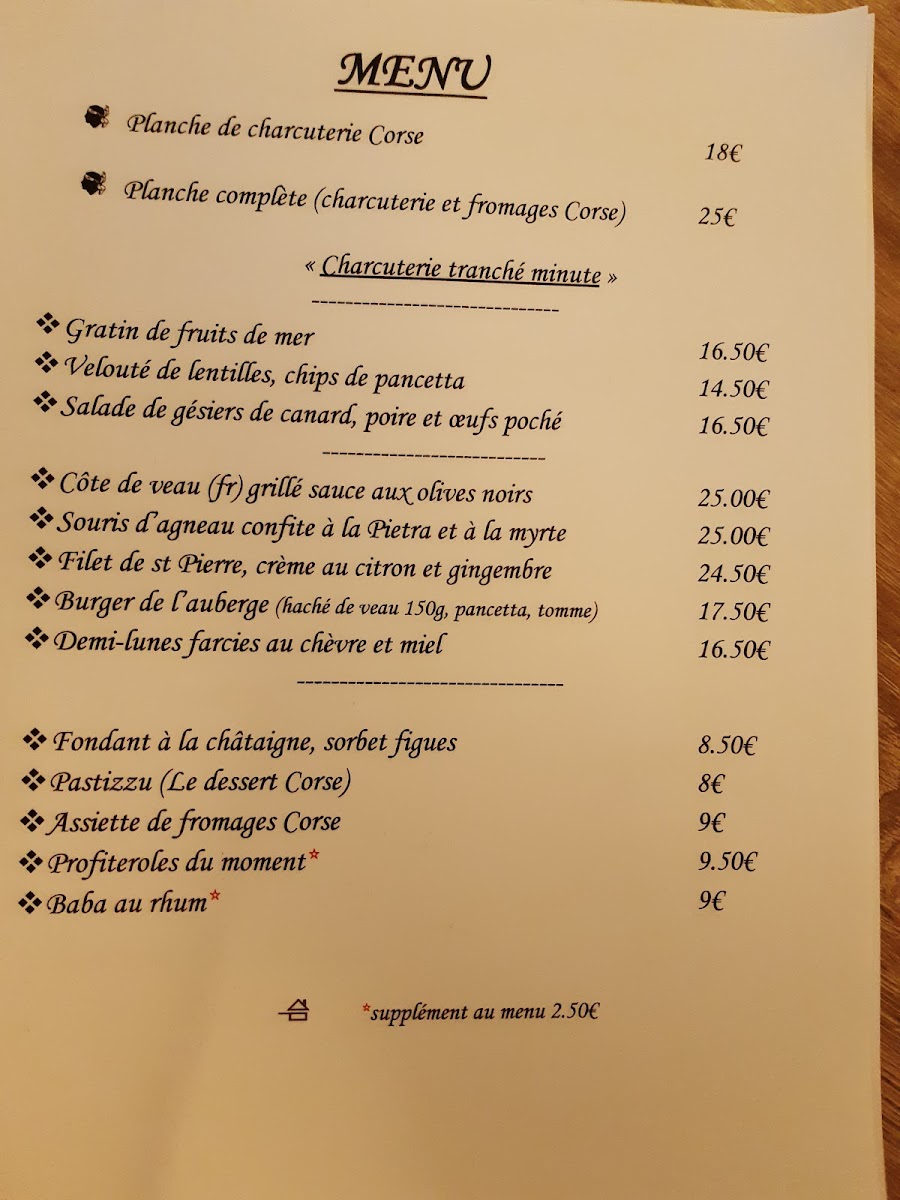 The menu at Auberge Saint Roch / Restaurant Corse offers a delightful mix of traditional Corsican dishes with a focus on fresh, quality ingredients. For those looking to begin their meal, the Planche de charcuterie Corse is a standout, offering a selection of Corsican cold cuts, while the Planche complète provides a more substantial offering. The starters feature comforting options like the Gratin de fruits de mer and the Velouté de lentilles, as well as a hearty Salade de gésiers de canard. Moving on to the main courses, the Côte de veau (fr) grillé promises a tender, grilled veal cut, while the Souris d'agneau confite is a slow-cooked lamb shank that melts in your mouth. For something lighter, the Filet de st Pierre offers a beautifully prepared fish dish, and the Burger de l'auberge provides a delicious local twist on a classic favorite. The menu also includes Demi-lunes farcies, savory stuffed pastries. Desserts offer a satisfying end to the meal, with options such as the rich Fondant à la châtaigne and the Corsican Pastizzu, a regional treat. For cheese lovers, the Assiette de fromages Corse showcases a selection of local cheeses, while the Profiteroles du moment and Baba au rhum are indulgent sweet options. The restaurant also offers a Menu 25€ and Menu 35€, allowing diners to enjoy a well-rounded selection of dishes at a great value. Whether you choose from the à la carte options or a fixed-price menu, Auberge Saint Roch / Restaurant Corse delivers an exceptional dining experience that highlights the best of Corsican cuisine.